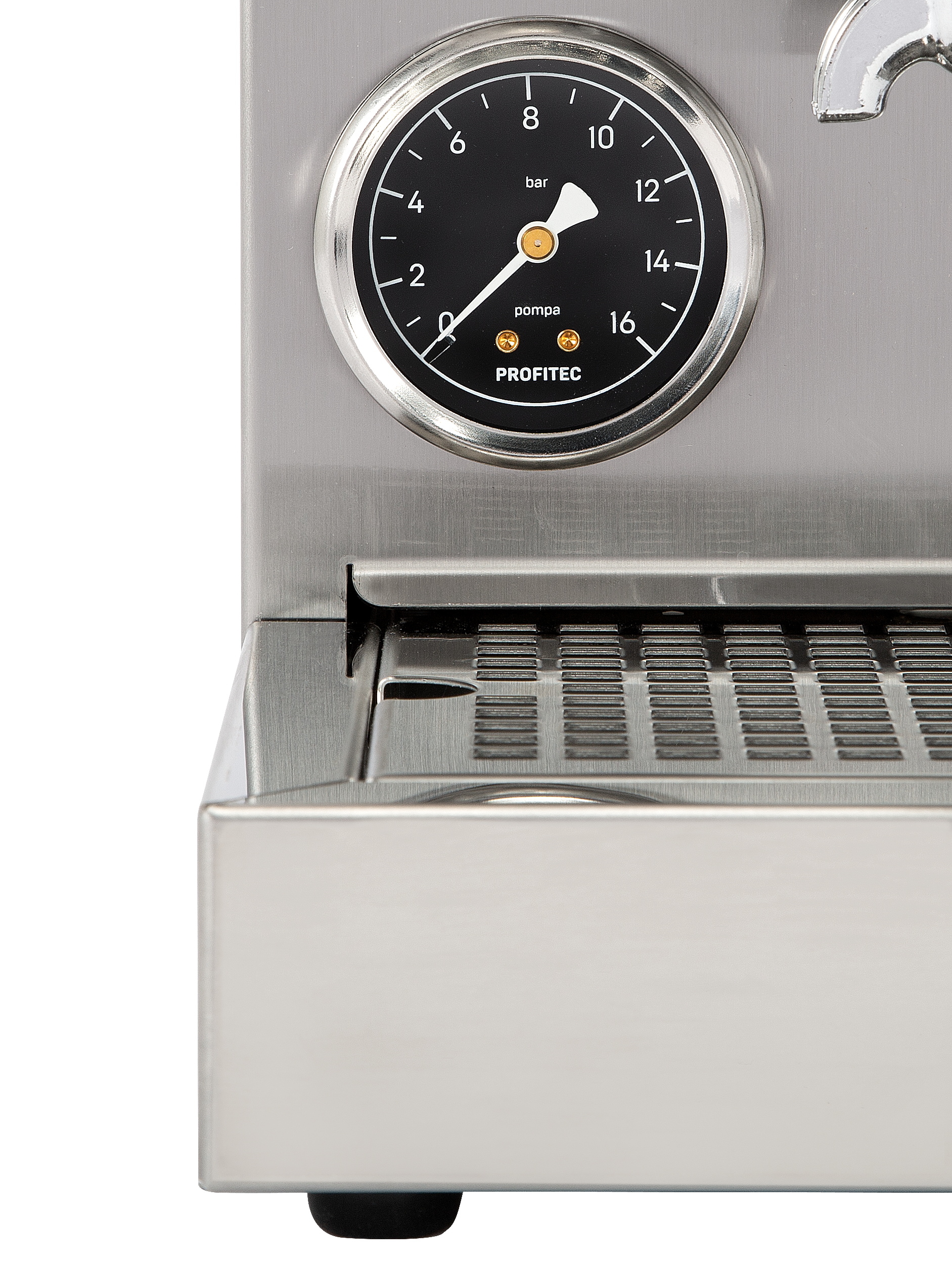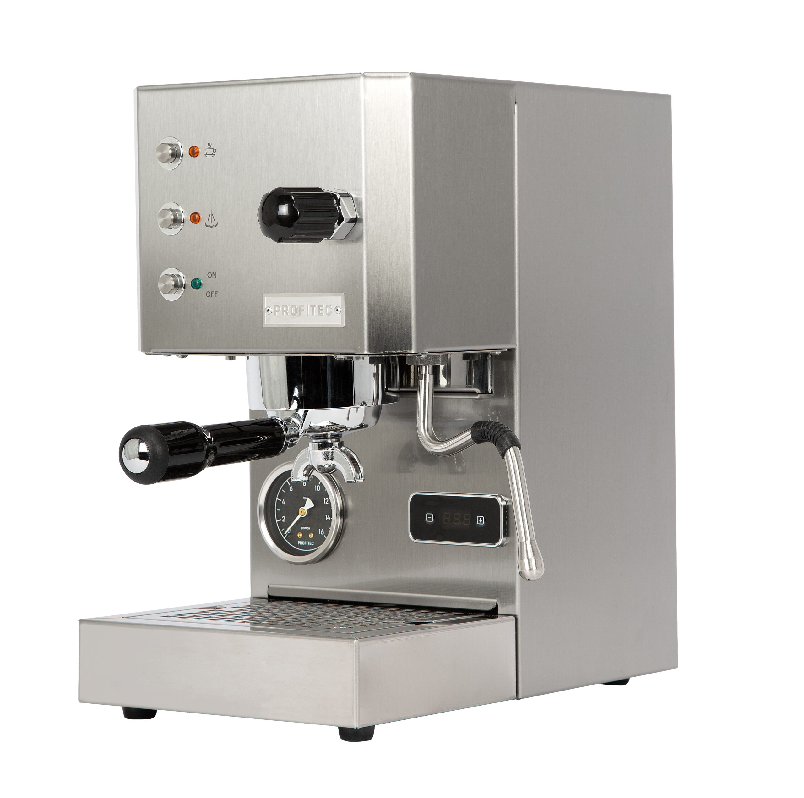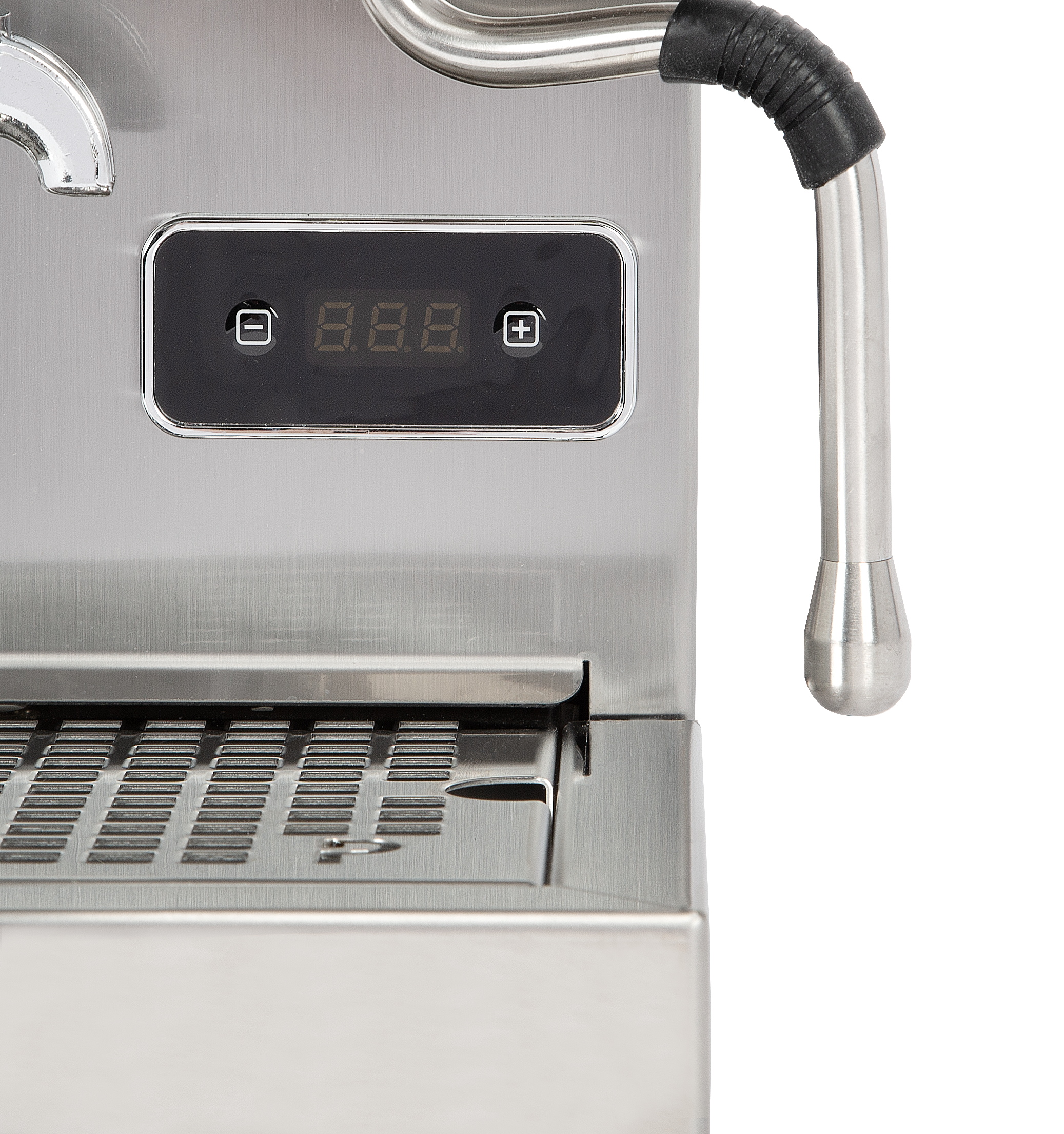 Expansionsventil zur Einstellung des Brühdrucks, Bedientasten, Drehventil zur Dampfentnahme, Tassenablageblech,